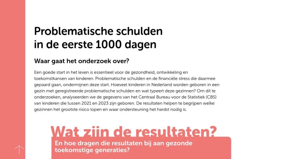 Een goede start in het leven is essentieel voor de gezondheid, ontwikkeling en toekomstkansen van kinderen. Problematische schulden en de financiële stress die daarmee gepaard gaan, ondermijnen deze start. Hoeveel kinderen in Nederland worden geboren in een gezin met geregistreerde problematische schulden en wat typeert deze gezinnen? Om dit te onderzoeken, analyseerden we de gegevens van het Centraal Bureau voor de Statistiek (CBS) van kinderen die tussen 2021 en 2023 zijn geboren. De resultaten helpen te begrijpen welke gezinnen het grootste risico lopen en waar ondersteuning het hardst nodig is.
