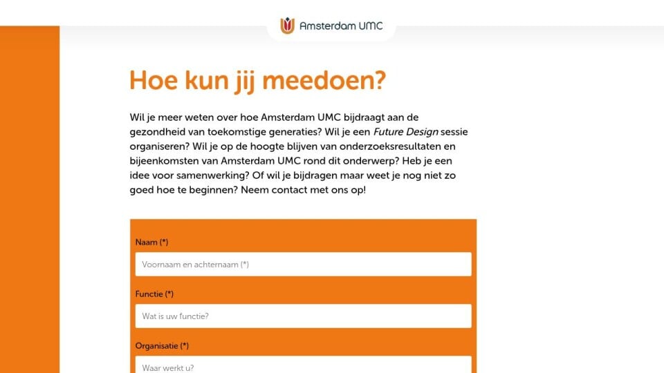 Wil je meer weten over hoe Amsterdam UMC bijdraagt aan de gezondheid van toekomstige generaties? Wil je een Future Design sessie organiseren? Wil je op de hoogte blijven van onderzoeksresultaten en bijeenkomsten van Amsterdam UMC rond dit onderwerp? Heb je een idee voor samenwerking? Of wil je bijdragen maar weet je nog niet zo goed hoe te beginnen? Neem contact met ons op!