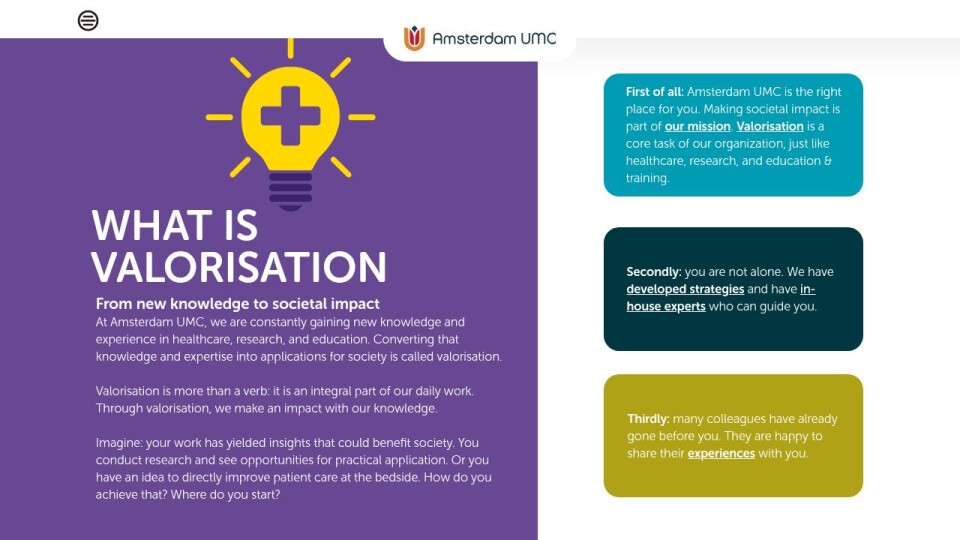 First of all: Amsterdam UMC is the right place for you. Making societal impact is part of our mission. Valorisation is a core task of our organization, just like healthcare, research, and education & training.