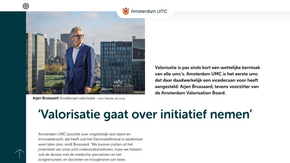 Valorisatie is pas sinds kort een wettelijke kerntaak van alle umc’s. Amsterdam UMC is het eerste umc dat daar daadwerkelijk een vicedecaan voor heeft aangesteld: Arjen Brussaard, tevens voorzitter van de Amsterdam Valorisation Board.